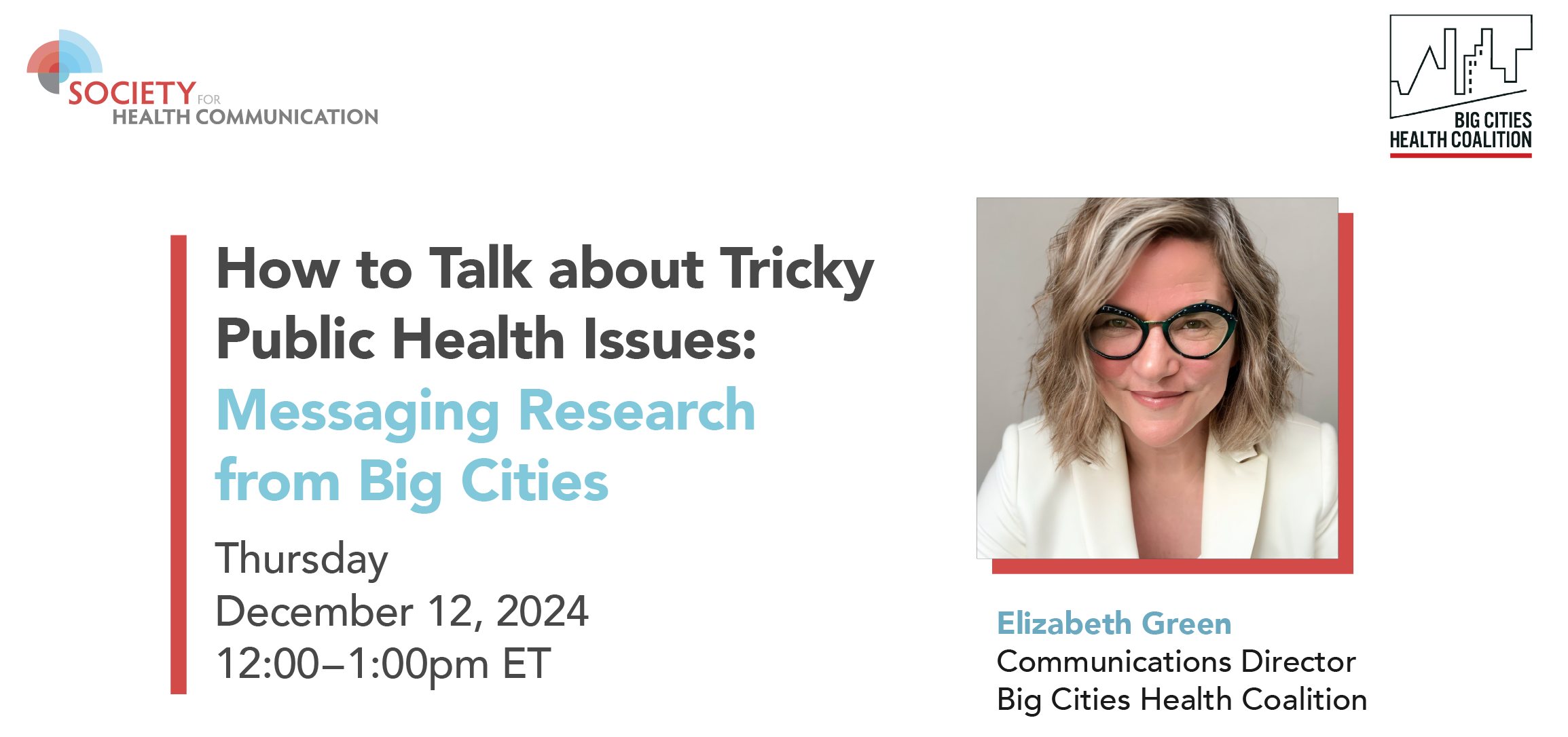 The Society for Health Communication is hosting a free webinar in partnership with Big Cities Health Coalition this Thursday, December 12, from 12:00-1:00 p.m. ET as part of its Level-Up Learning series: How to Talk about Tricky Public Health Issues, Messaging Research from Big Cities.
