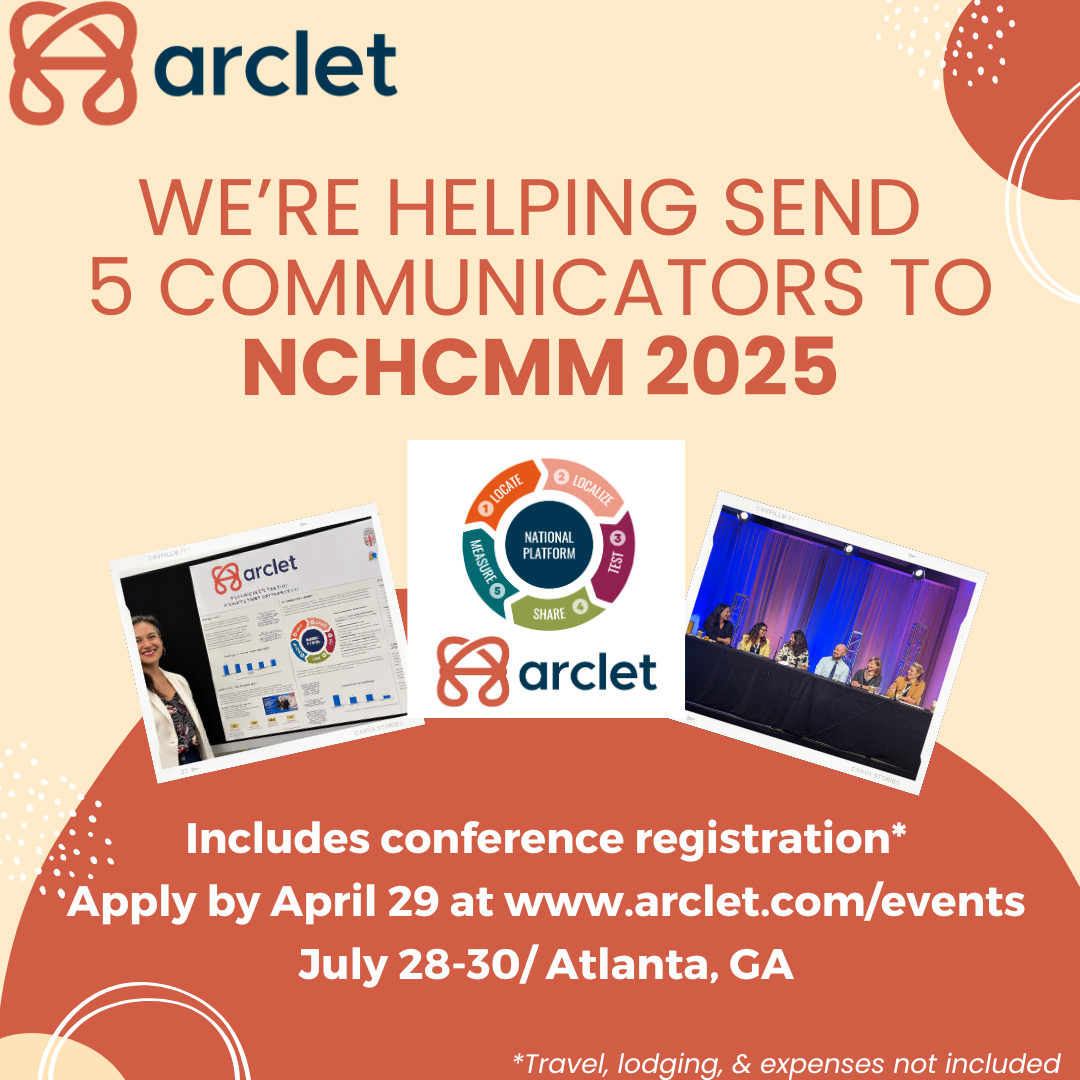 Arclet, a national platform supporting public health communicators, is covering registration for five individuals to attend the 2025 National Conference on Health Communication, Marketing, and Media (NCHCMM), held July 28–30 in Atlanta. Priority will be given to applicants working in rural or under-resourced communities or those recently laid off due to public health funding cuts.