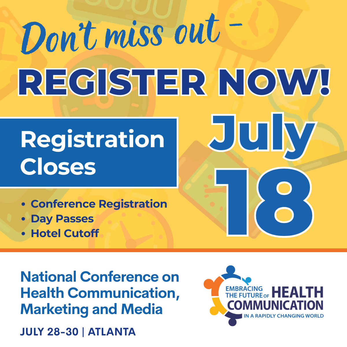 Register by THIS Friday, July 18 to join public health communicators from across the country at the 2025 National Conference on Health Communication, Marketing & Media (NCHCMM), happening July 28–30 in Atlanta, GA. Whether attending for one day or all three, participants will gain access to keynotes from Dr. Garth Graham (YouTube Health) and actor/advocate Dyllón Burnside, hands-on workshops, career coaching, networking, and more.